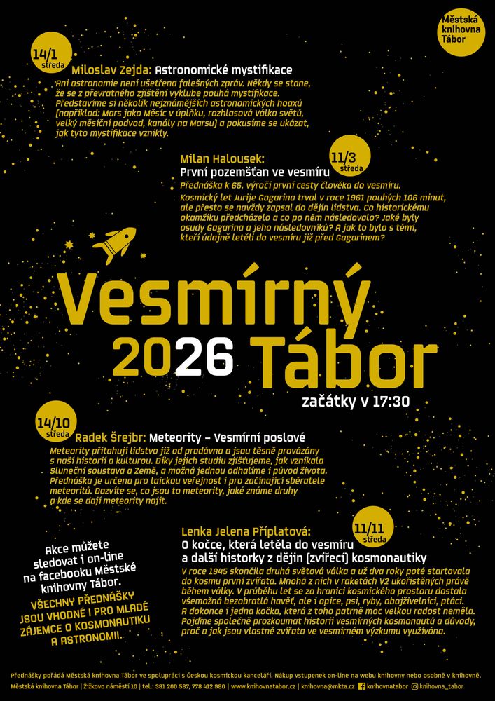 • Akce můžete sledovat i on-line na facebooku Městské knihovny Tábor. Zpětně můžete akce shlédnout na našem YouTube kanálu, kde najdete kosmické a jiné akce pořádané knihovnou.